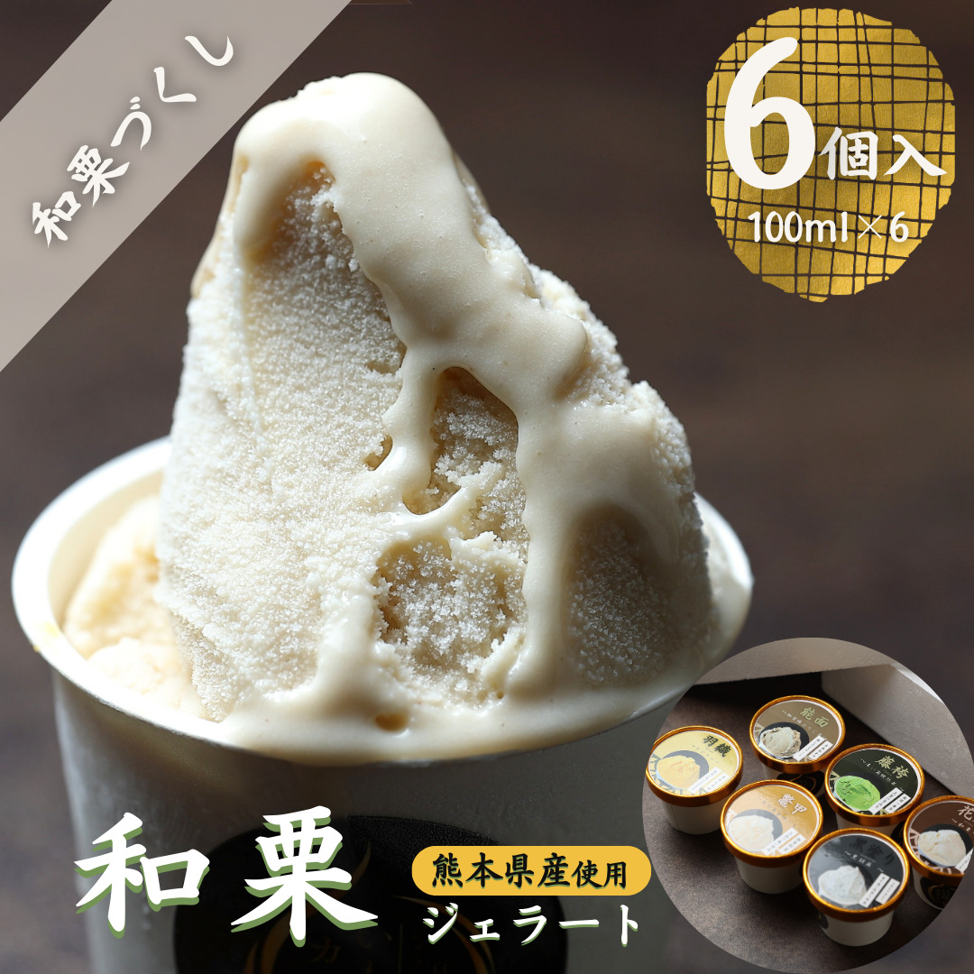 【商品名:花魁(和栗)6個入りセット】 高級和栗を贅沢に使用した、花柳 百万石ジェラートの人気フレーバー「花魁(おいらん)」を6個セットにした特別なギフト商品です。厳選された熊本県産の和栗をふんだんに使い、濃厚な甘さと香りを最大限に引き出したクリーミーなジェラートに仕上げました。