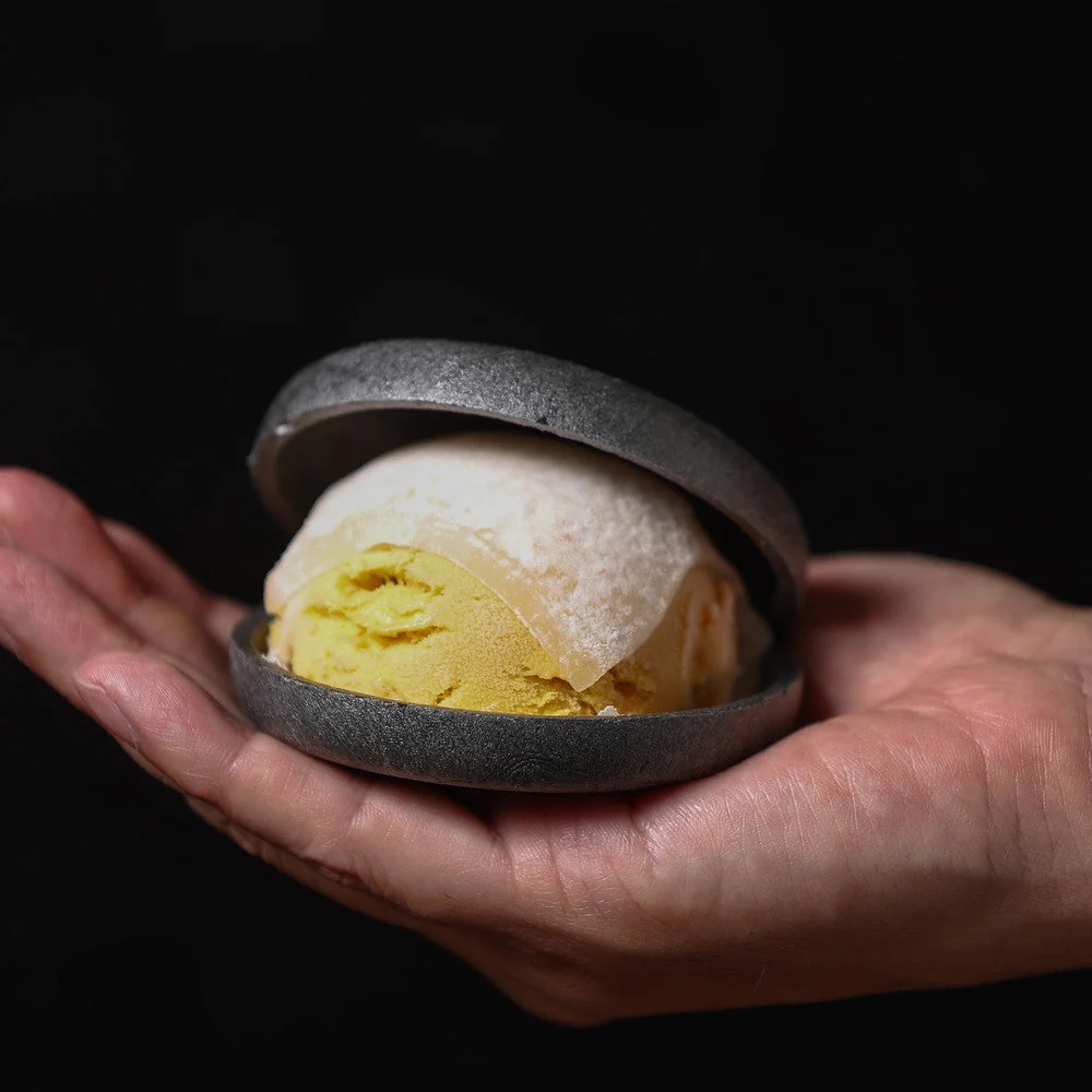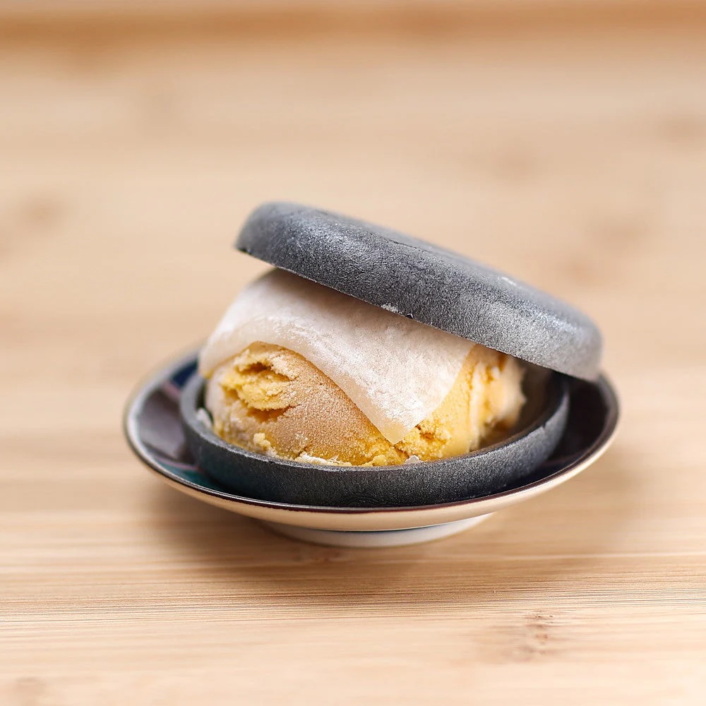 もっちり大福で包んだ特製ジェラートを、食べる直前に香ばしい黒最中でサンド。